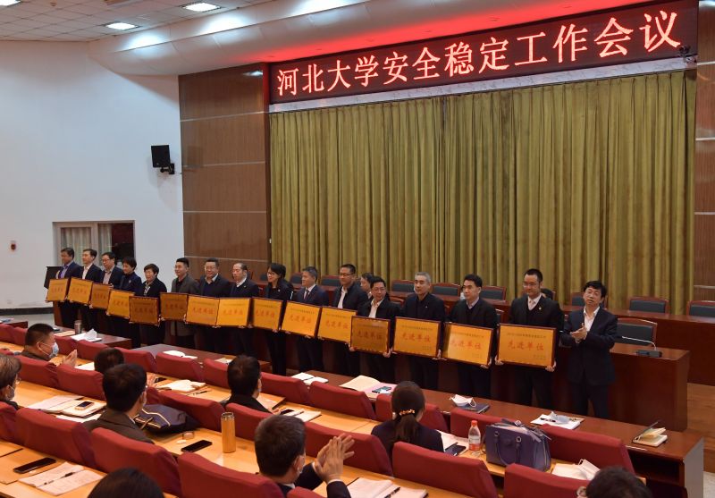 会上,副校长申世刚宣读了中共河北大学委员会《关于表彰2019-2020年度安全稳定工作先进单位的决定》,党委书记郭健为数学与信息科学学院、化学与环境科学学院、艺术学院、公共卫生学院、外国语学院、质量技术监督学院、宋史中心、校团委、国际合作处、后勤与资产管理处、医学部、博物馆、信息技术中心、赫达实业有限公司、出版社等15个受表彰单位颁发了奖牌。