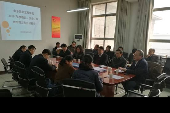 电信学院2016年度稳定、安全、综合治理工作自评汇报会在电信楼四楼会议室进行。安全工作处处长王仲华通报了此次检查考评的要求和内容,会议由第2检查组组长郑保平主任主持,首先电信学院党委书记郝真鸣致词,对校领导和各位检查组组长成员的到来表示热烈的欢迎,并简单介绍了电信学院对稳定、安全、综合治理工作的部署及自评工作的安排。常务副院长赵杰作了《电子信息工程学院2016年度稳定、安全、综合治理工作自评报告》,报告从加强领导,完善制度,严格落实网格化管理工作;预防为主,强化教育,安全意识常抓不懈;认真落实值班制度,建立四级预警机制,确保信息渠道畅通;重点部位重点防范,普查与抽查结合,建立危险防控长效机制;加强网络信息安全管理,通过新媒体平台加强师生安全教育等五个方面进行了汇报。同时,检查组对我院自评材料进行审查和查阅。