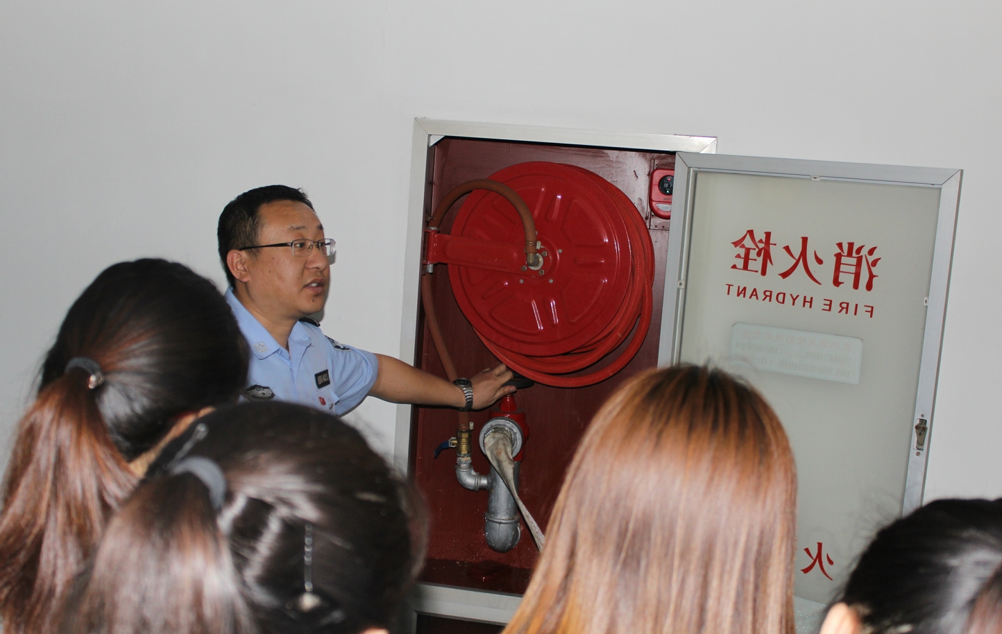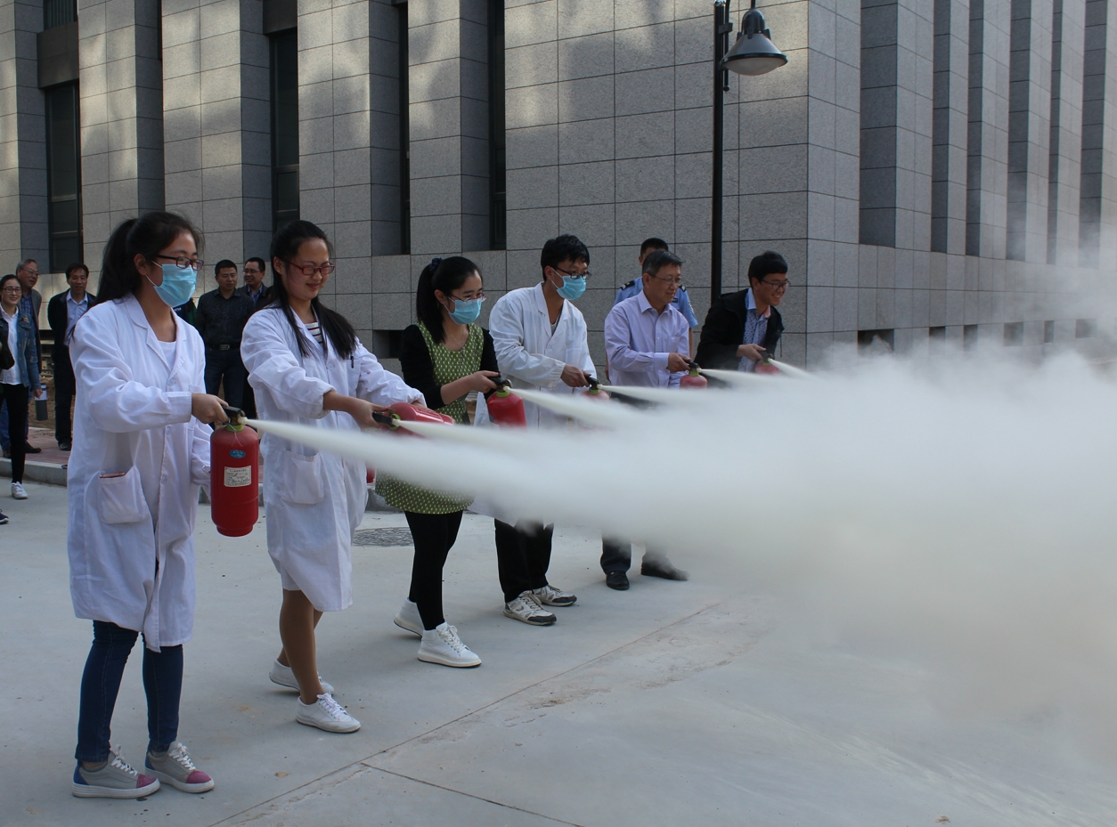 消防知识培训后,学院师生分成六个小组,在学校安全工作处消防科科长周新兵的组织带领下,首先在逸夫楼西配楼进行了疏散逃生演练,当西配楼5层模拟火灾地点升起烟雾和警报响起时,各楼层安全负责人组织实验室学生用湿毛巾捂住口鼻,靠近墙面弯腰有序地快速疏散撤离。其次在逸夫楼西侧,师生还进行了灭火设施的操作体验和消火栓使用等火灾初期扑救演练。