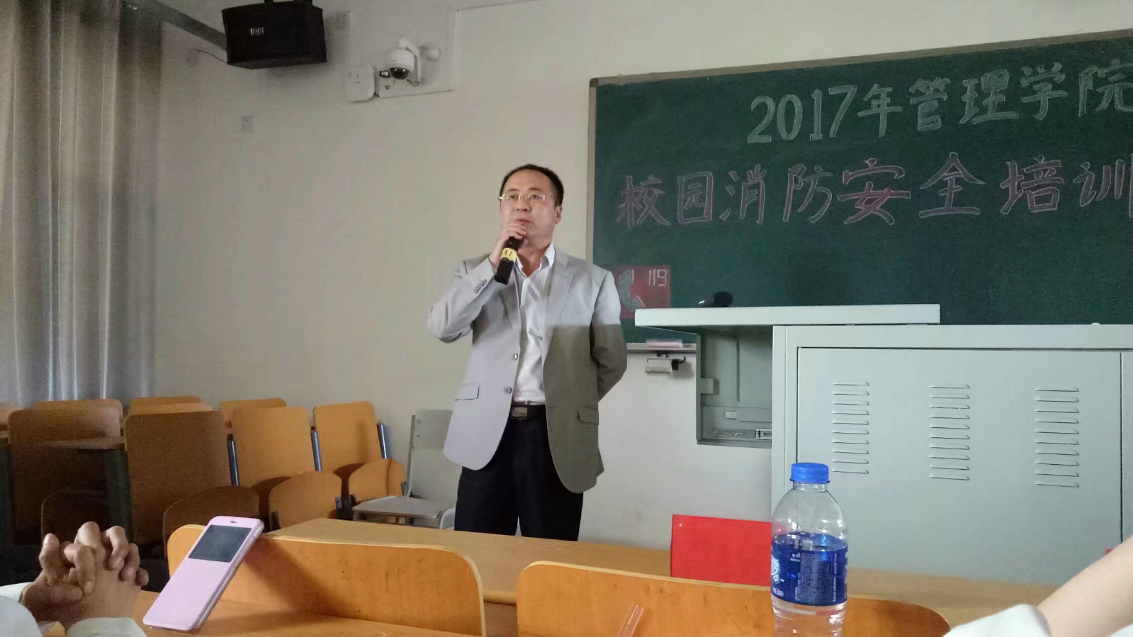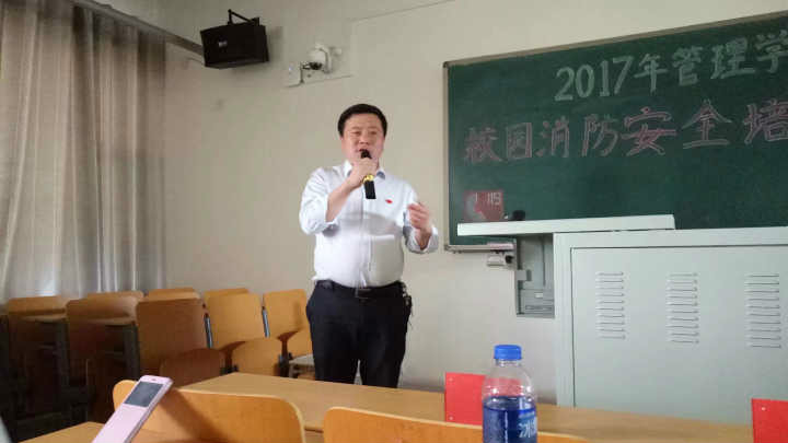 本期校园安全培训营分为理论讲解和实践演习两部分。消防知识讲座在六教505举行,由管理学院团委书记郑艳菊主持。讲座中,管理学院党委副书记刘东岳首先致辞,刘东岳书记以河北大学的切身案例作为背景讲述,提醒同学们消防安全要警钟长鸣,防火防灾要从小事做起。并对到场同学提出三点要求,一要认真学习消防知识,二要做好宣传工作,让更多同学从中受益,三要以身作则,养成良好用电习惯。