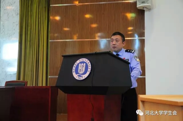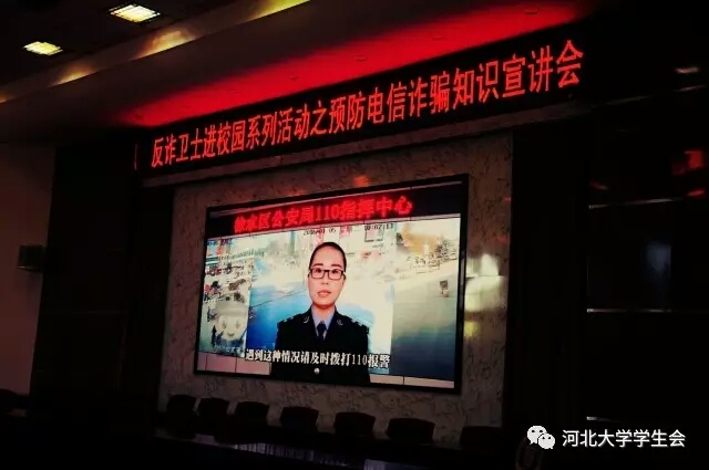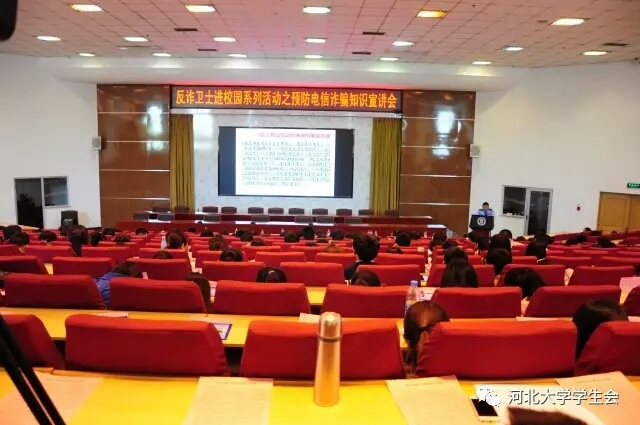 4月27日上午十点,反诈卫士进校园系列活动之预防电信诈骗知识宣讲会在主楼304报告厅举办。近日来,通过校学生会的走访调查和学生们的意见反馈,我们发现电信诈骗悄然进入了大学生群体当中,严重侵犯着同学们的权益。在学校的大力支持下,校学生会权益部联系保定市防电信网络诈骗中心及我校团委、安全工作处后, 组织开展了此次宣讲活动。参加此次会议的有河北大学团委副书记张小升,河北大学安全工作处副处长李大伟,保定市防电信网络诈骗中心负责人韩建设,保定市防电信网络诈骗中心队长李晓光、崔健,河北大学校聘团委副书记吴限泽,以及保定市反电信网络诈骗中心的电信运营商、银行系统等相关工作人员。校学生会权益部部长张羽嘉主持了会议。