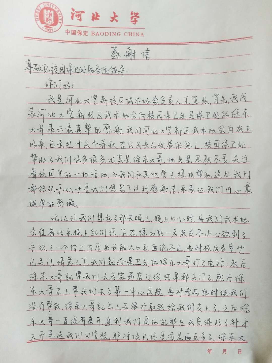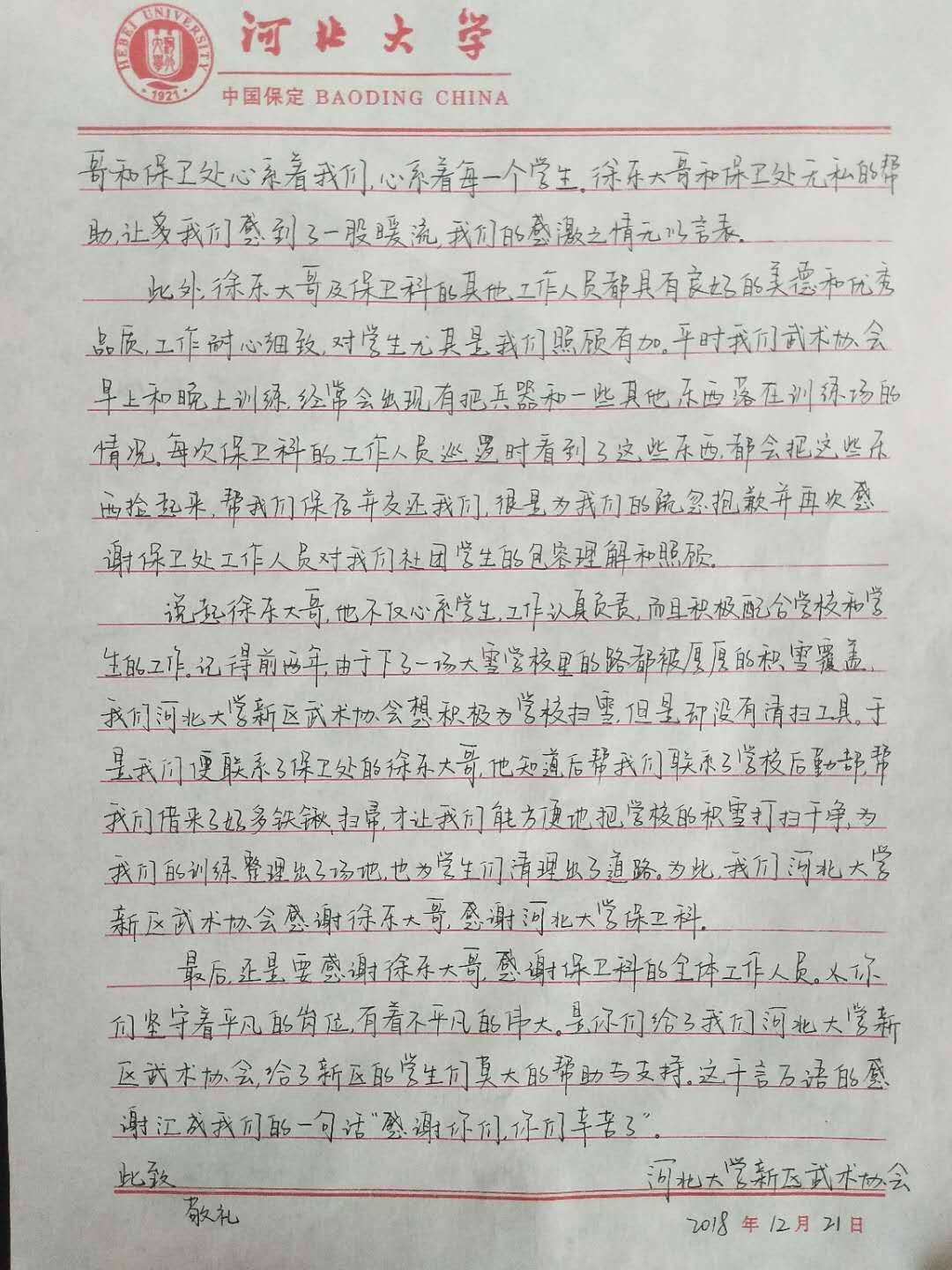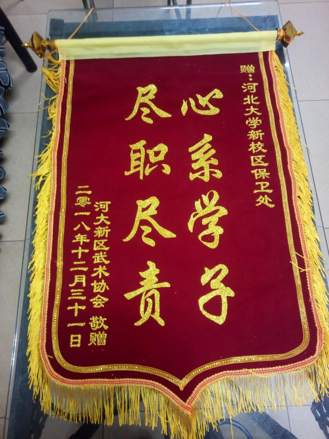 新校区武术协会的同学们非常感动,写来了感谢信,并专门给新校区安全工作处送来了一面写有“尽职尽责 心系学子”的锦旗。感激之情溢于言表。在感谢信中,这位同学写到,治安二科不仅是徐东大哥,其他的安保工作人员在平时他们的训练中,也经常热心地帮助他们,将训练后丢掉的器材捡到后及时归还这类的事情时有发生。