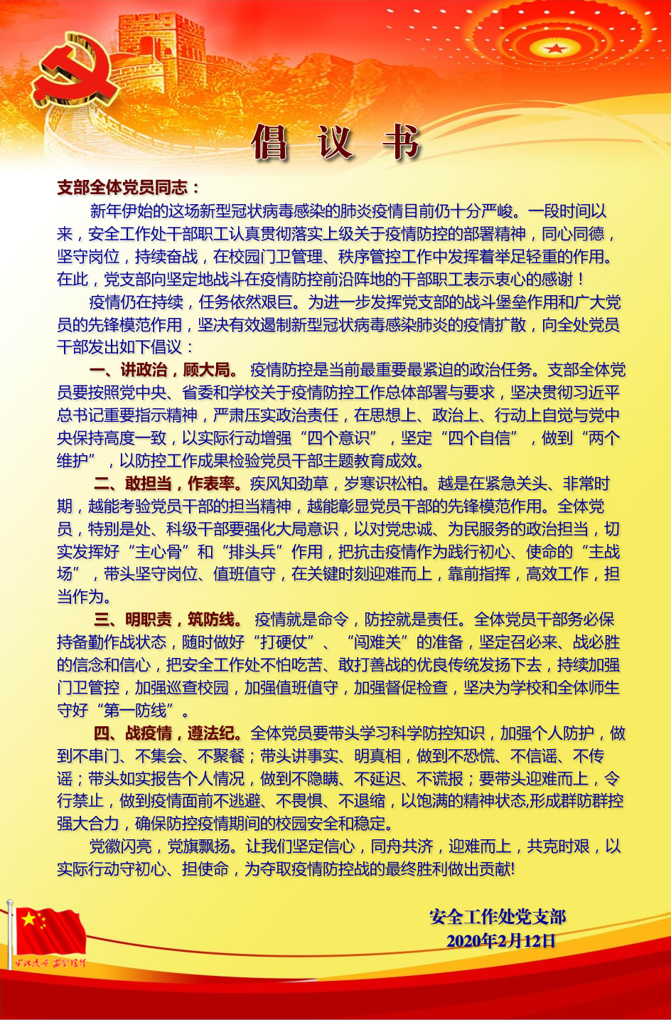 2月12日,党支部发出倡议书,号召党员干部立即行动起来,冲锋在前,勇挑重担,共同夺取疫情防控阻击战的最终胜利。