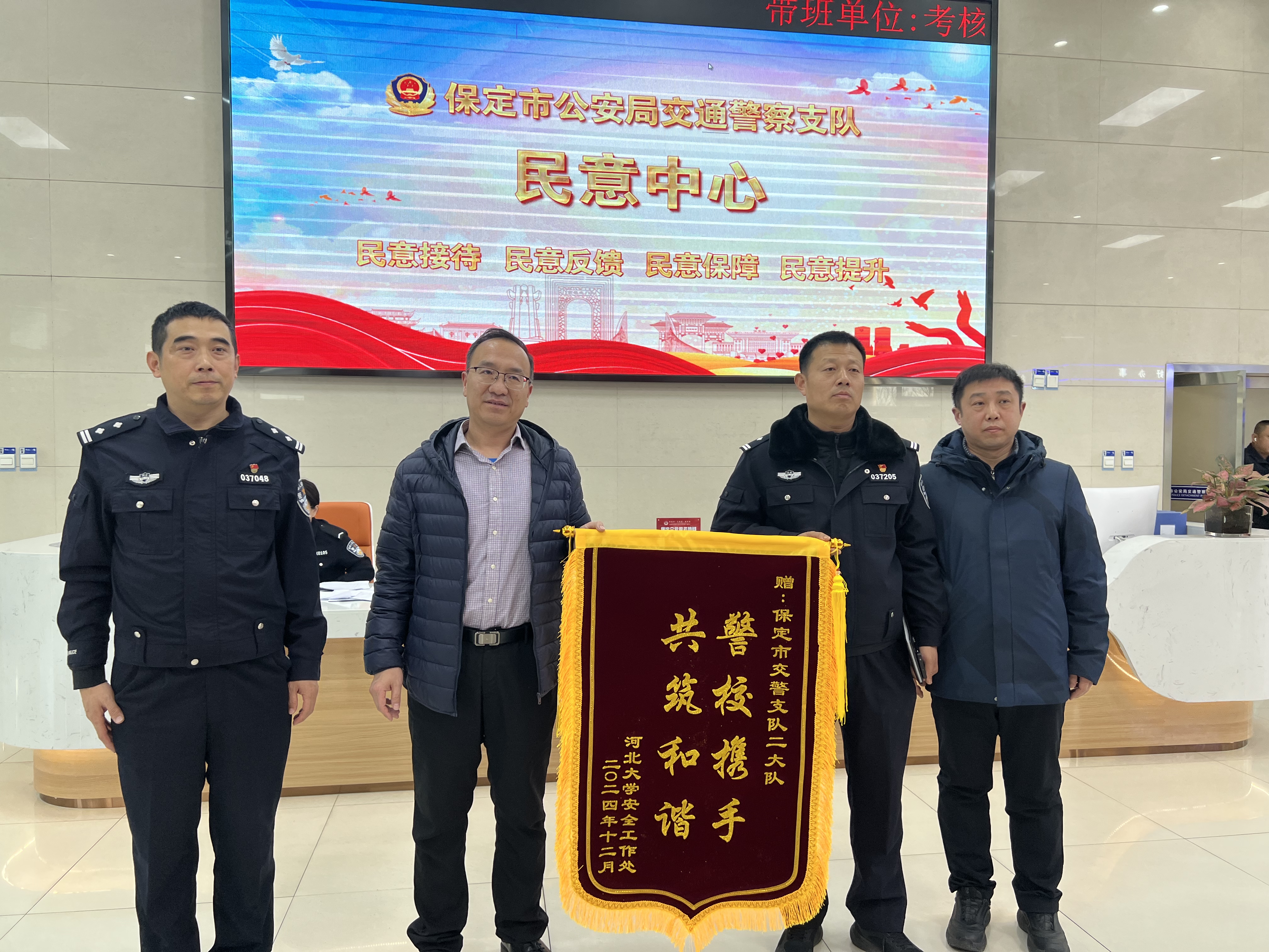 交流座谈会上,党委保卫部/安全工作处党支部书记于泽与保定市交警支队二大队党支部组织委员、副大队长梁双保就党建引领下如何更好地开展校园及周边交通安全管理工作进行了深入交流与探讨,针对校园周边交通拥堵、电动自行车闯红灯等问题提出了切实可行的解决方案。双方一致认为,要以此次共建活动为契机,建立常态化沟通协作机制,共同打造“平安校园”和“平安交通”。会后,党委保卫部/安全工作处党支部向保定市交警支队二大队赠送了锦旗。
